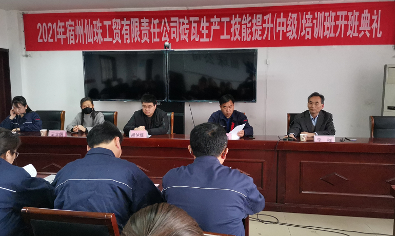 宿州仙珠工貿(mào)有限責(zé)任公司磚瓦生產(chǎn)工(中級)技能提升培訓(xùn)開班典禮于2021年4月13日下午3時在宿州仙珠工貿(mào)有限責(zé)任公司培訓(xùn)中心隆重舉行。宿州市人社局職建科科長周仲璞、王立娟,宿州仙珠工貿(mào)有限責(zé)任公司總經(jīng)理蔡成偉,宿州東潤職業(yè)培訓(xùn)學(xué)校副書記李群出席開班典禮,開班典禮由仙珠公司人力資源部部長張琳主持,宿州仙珠公司四十多名參訓(xùn)員工參加了開班典禮。