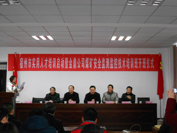 2015年2月7日上午,宿州市企業(yè)實(shí)用人才培訓(xùn)及金鼎公司煤礦安全監(jiān)測(cè)監(jiān)控技術(shù)培訓(xùn)班開(kāi)班班儀式在金鼎公司辦公大樓培訓(xùn)教室隆重舉行。出席此次開(kāi)班典禮有宿州市委組織部人才辦主任侯立芬,科長(zhǎng)李鑫,我中心首席專(zhuān)家張立今,我中心副主任、宿州東潤(rùn)職業(yè)培訓(xùn)學(xué)校校長(zhǎng)代兆會(huì),宿州市金鼎公司董事長(zhǎng)蔡長(zhǎng)輝、副總經(jīng)理蔣萍,我中心特聘教授、高級(jí)工程師、淮北礦業(yè)集團(tuán)通風(fēng)主任工程師李同志以及參加培訓(xùn)的50名金鼎公司職工。