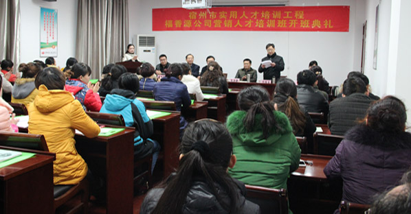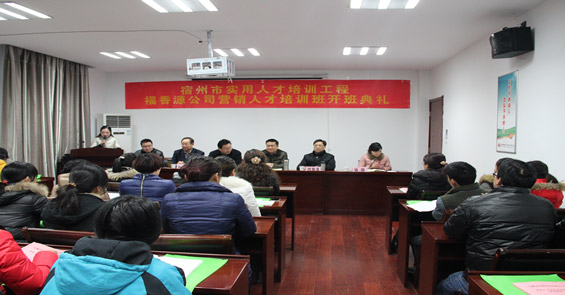 2015年2月28日上午9點,我中心承辦的宿州市實用人才培訓工程---福香源公司營銷人員培訓班開班典禮在福香源公司行政樓培訓教室隆重舉行。出席此次開班典禮在主席臺就座的領導有宿州市委組織部人才辦主任侯立芬,科長李鑫,我中心首席專家張立今,我中心副主任、宿州東潤職業(yè)培訓學校校長代兆會,宿州市福香源公司董事長張仲君、副總經(jīng)理楊晴,我中心特聘專家、海歸博士胡發(fā)剛。參加培訓的福香源公司50名營銷骨干人員精神飽滿的各就其位分享著開班的喜悅。